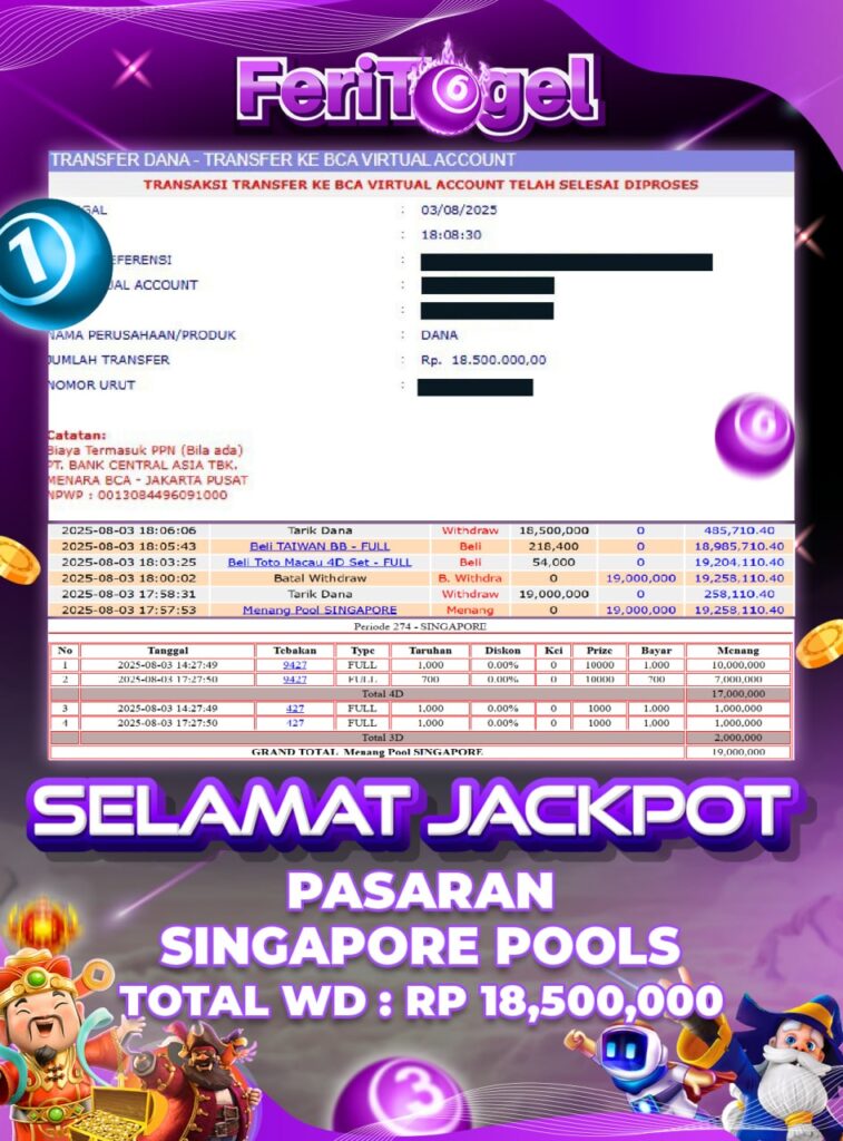 Feritogel senantiasa transparan dalam menunjukkan kemenangan member. Berikut merupakan sebagian fakta kemenangan terbaru yang terjadi di pasaran SINGAPORE POOLS
