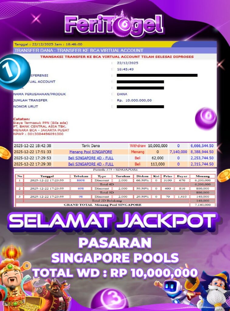 Feritogel senantiasa transparan dalam menunjukkan kemenangan member. Berikut merupakan sebagian fakta kemenangan terbaru yang terjadi di pasaran SINGAPORE